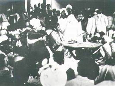 Top: Presiding over a meeting with Lokmanya Tilak addressing the gathering