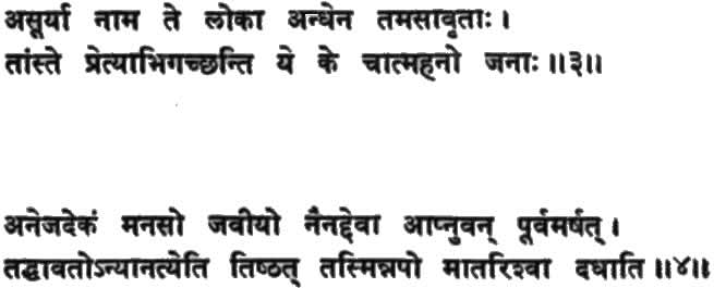 asuryd, sunless, and asuryd, Titanic or undivine. The third verse is, in the thought structure of the Upanishad, the starting-point for the final movement in the last four verses. Its suggestions are there taken up and worked out. The prayer to the Sun refers back in thought to the sunless worlds and their blind gloom, which are recalled in the ninth and twelfth verses. The sun and his rays are intimately connected in other Upanishads also with the worlds of Light and their natural opposite is the dark and sunless, not the Titanic worlds.