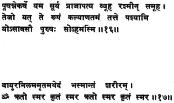 17. The Breath of things1 is an immortal Life, but of this body ashes are the end. OM! O Will,2 remember, that which was done remember! O Will, remember, that which was done, remember.