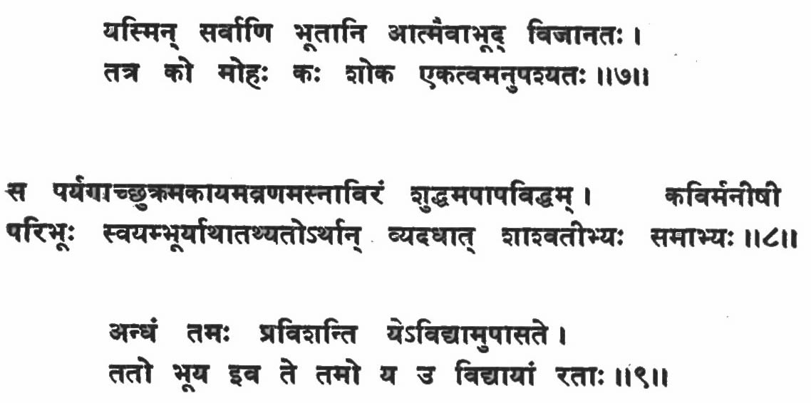 9. Into a blind darkness they enter who follow after the Ignorance, they as if into a greater darkness who devote themselves to the Knowledge alone.