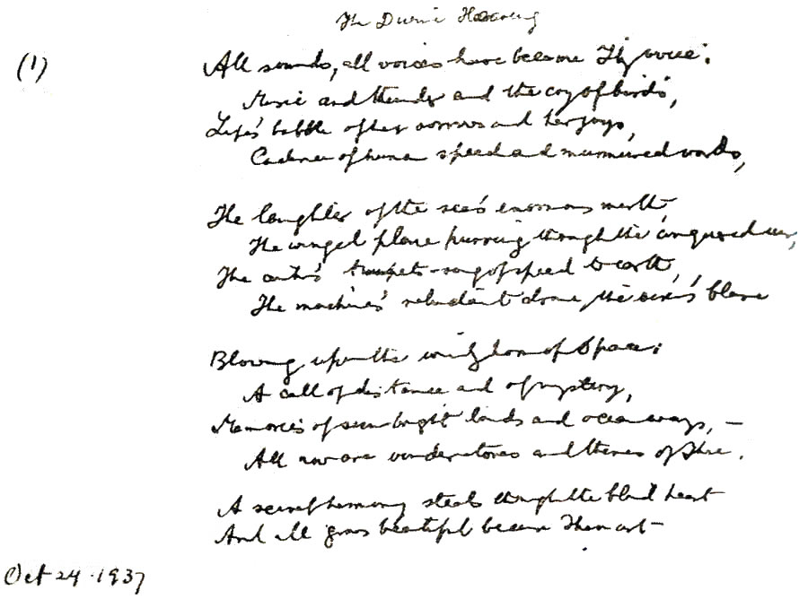 Music and thunder and the cry of birds, Cadence of human speech and murmured words,