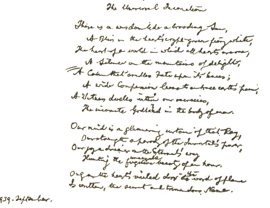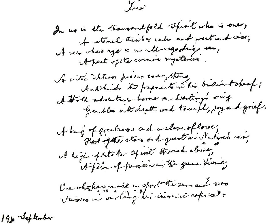 In His ray that dazzles our vision everywhere, Our half-closed eyes seek fragments of the One: Only the eyes of Immortality dare To look unblinded on that living Sun.