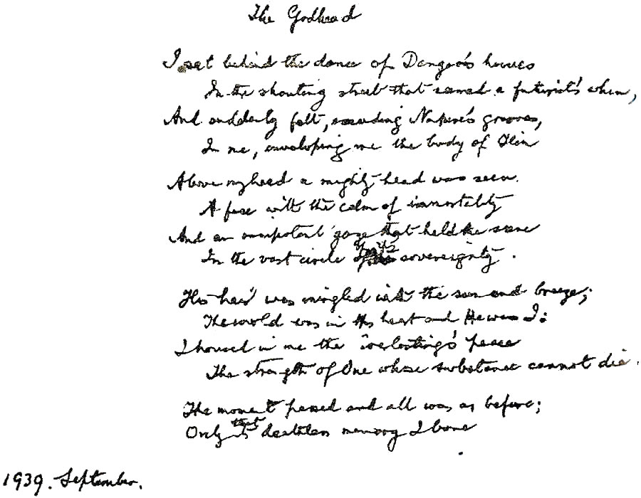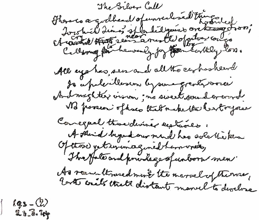 THERE is a godhead of unrealised things A cry seems near, a rustle of silver wings Calling to heavenly joy by earthly loss.