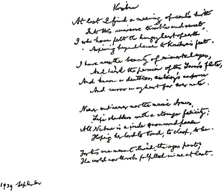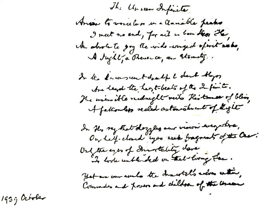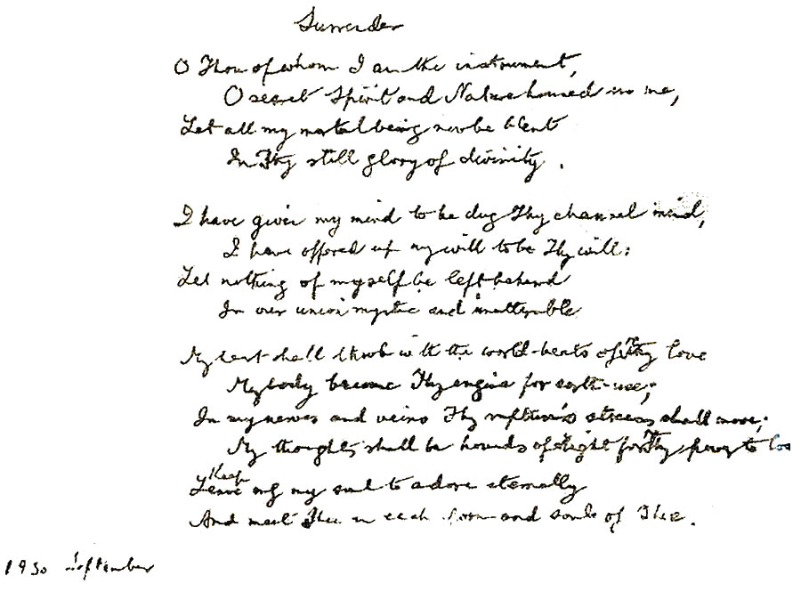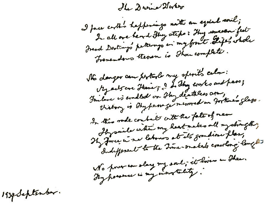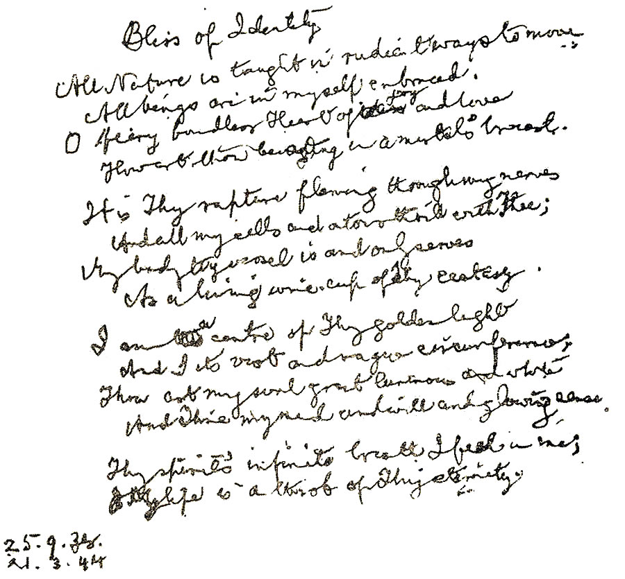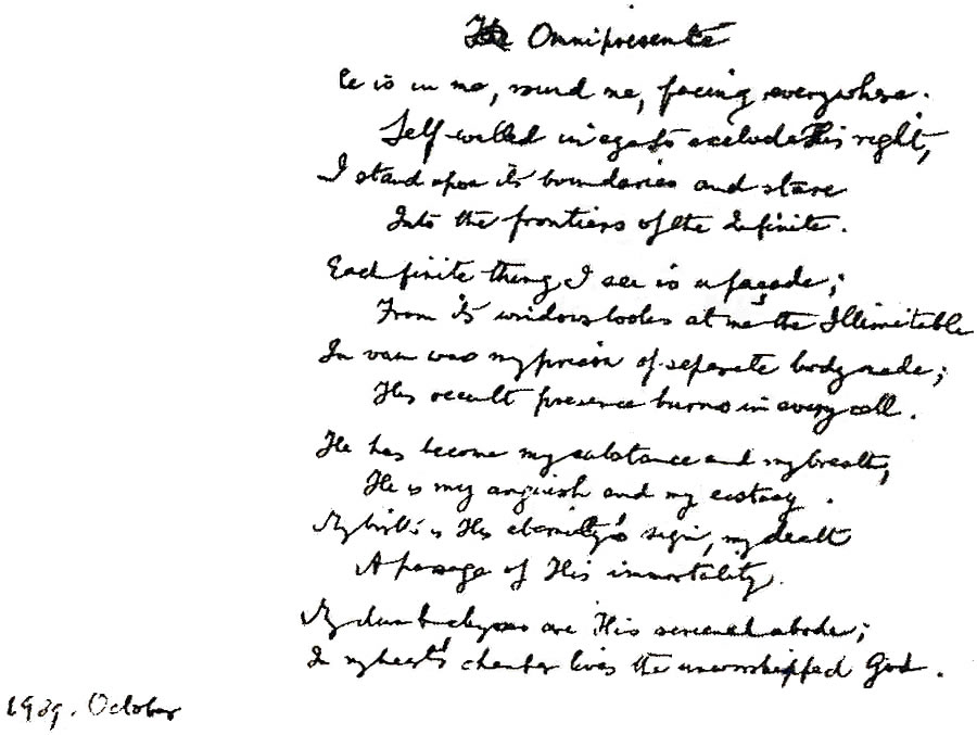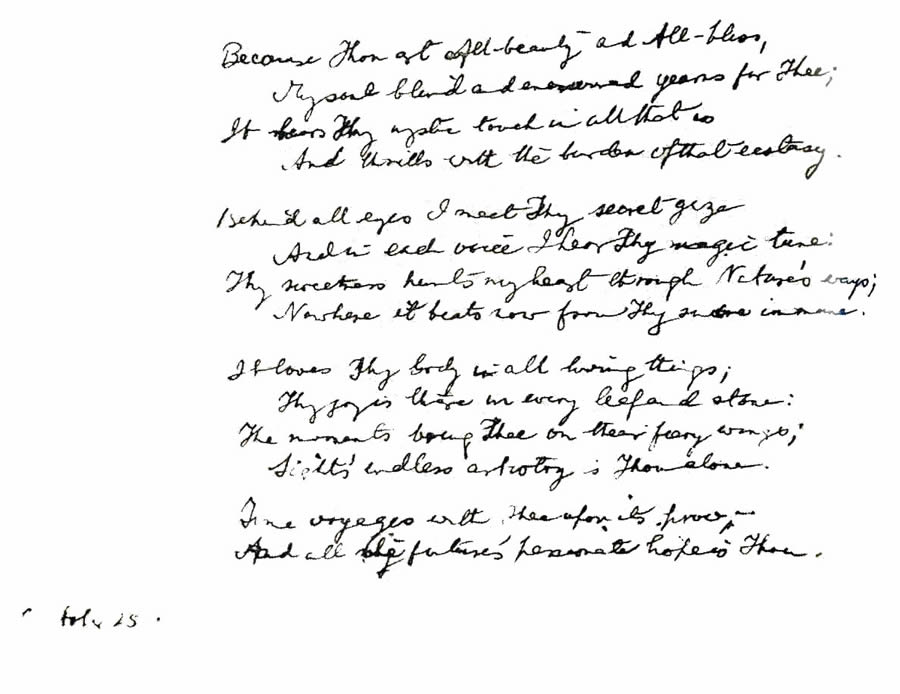 BECAUSE Thou art All-beauty and All-bliss, My soul blind and enamoured yearns for Thee; It bears Thy mystic touch in all that is And thrills with the burden of that ecstasy.