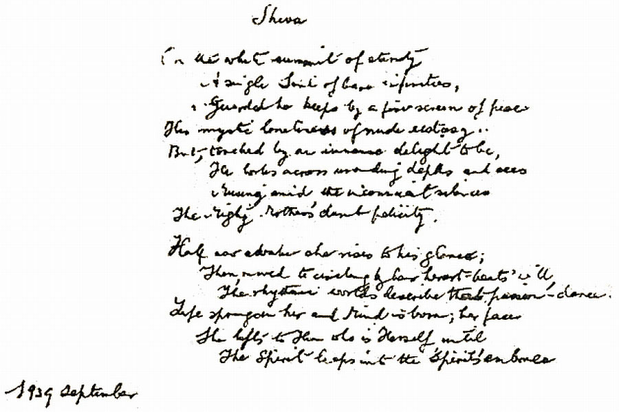 In that small flaming chariot Shiva rides. The One devised innumerably to be; His oneness in invisible forms he hides, Time's tiny temples of1 eternity.