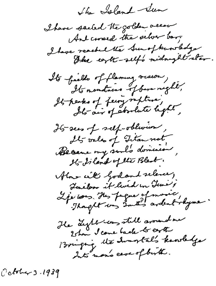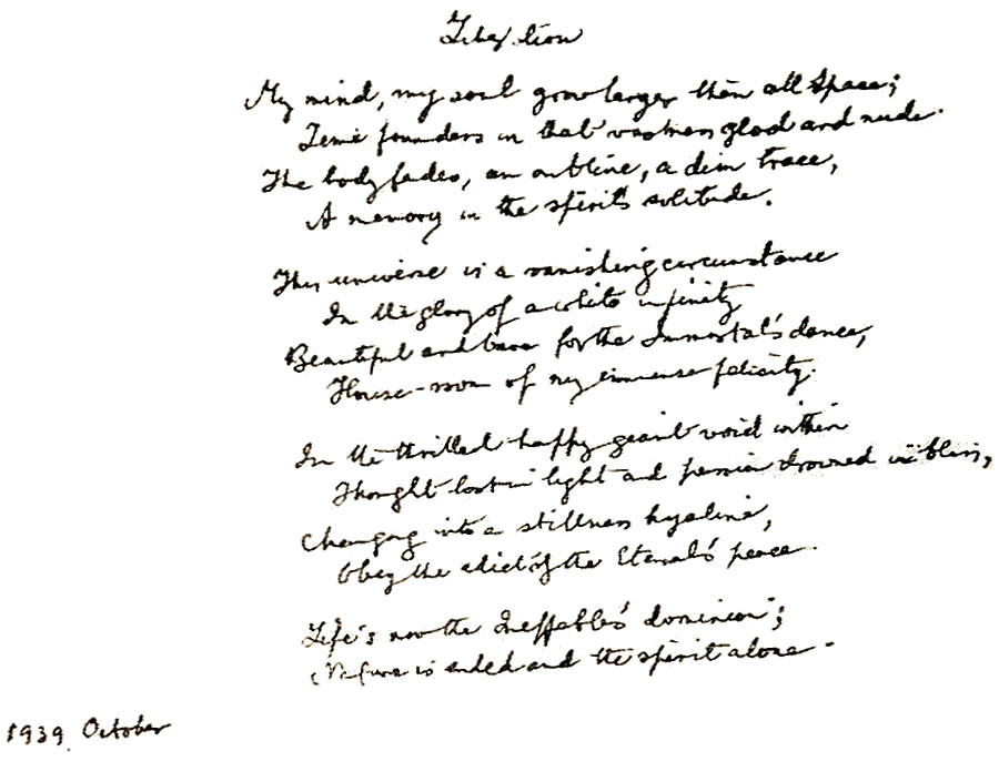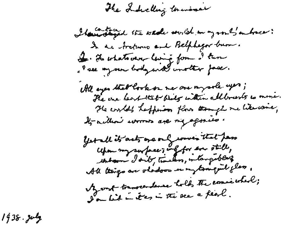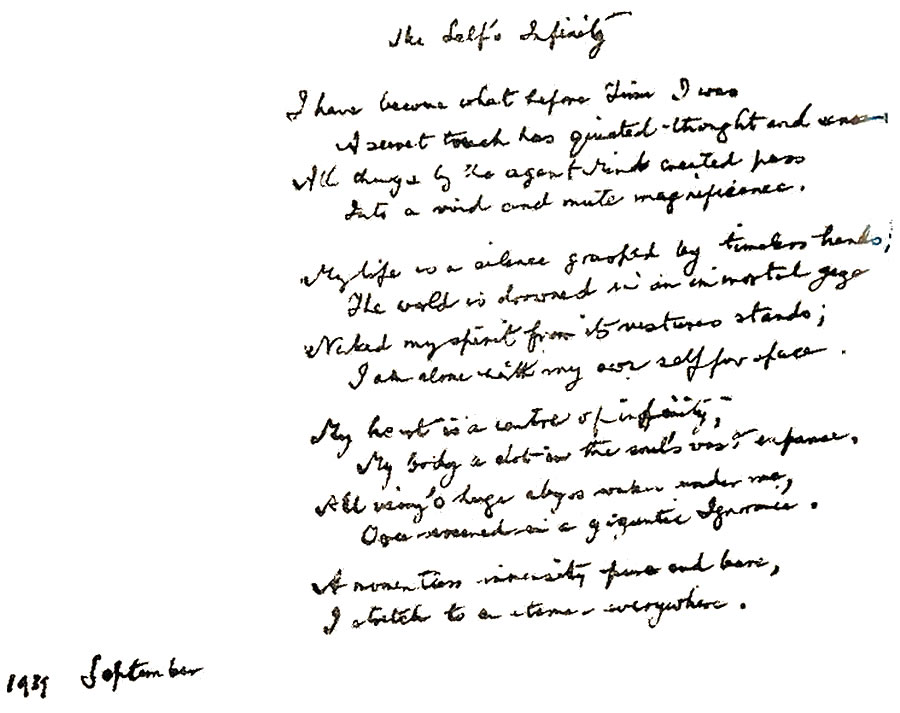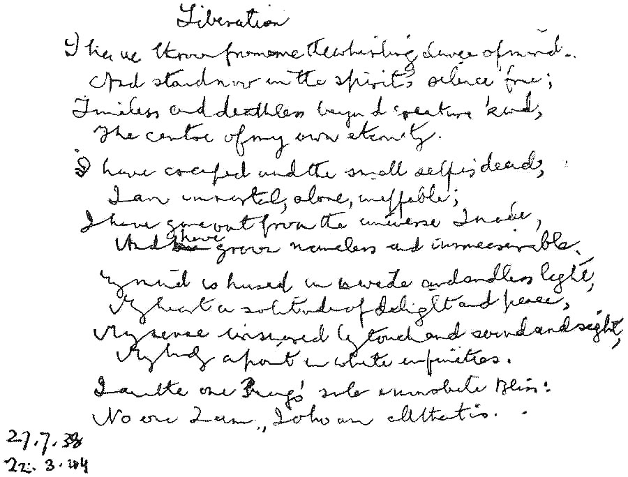 I have escaped and the small self is dead; I am immortal, alone, ineffable; I have gone out from the universe I made, And have grown nameless and immeasurable.