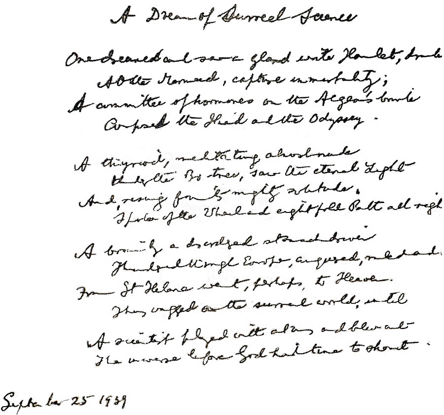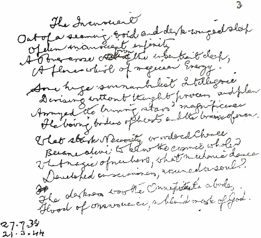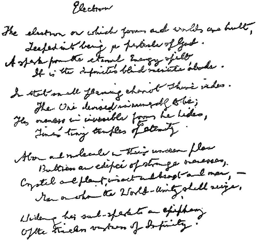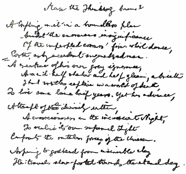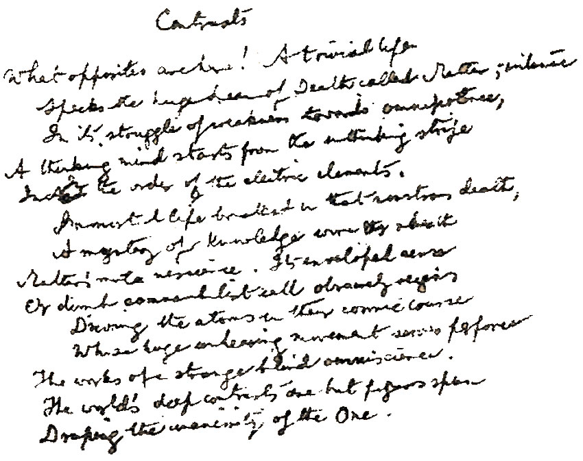 Specks the huge dream of Death called Matter; intense A thinking mind starts from the unthinking strife In the order of the electric elements.