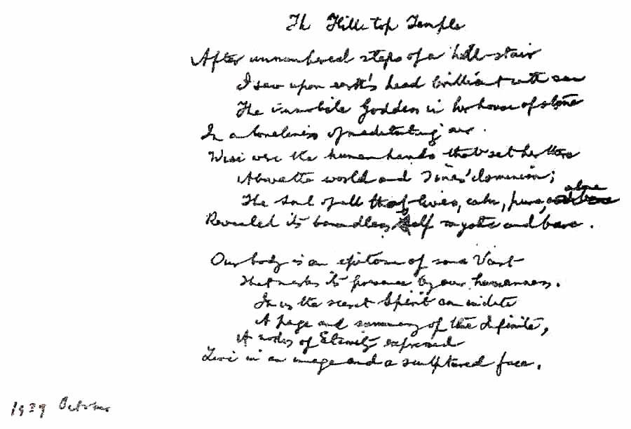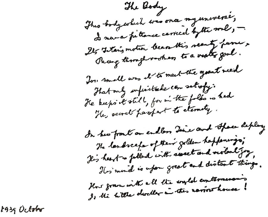 It loves Thy body in all living things; Thy joy is there in every leaf and stone: The moments bring Thee on their fiery wings; Sight's endless artistry is Thou alone.