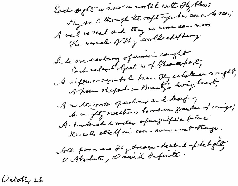 Each natural object is of Thee a part, A poem shaped in Beauty's living heart.