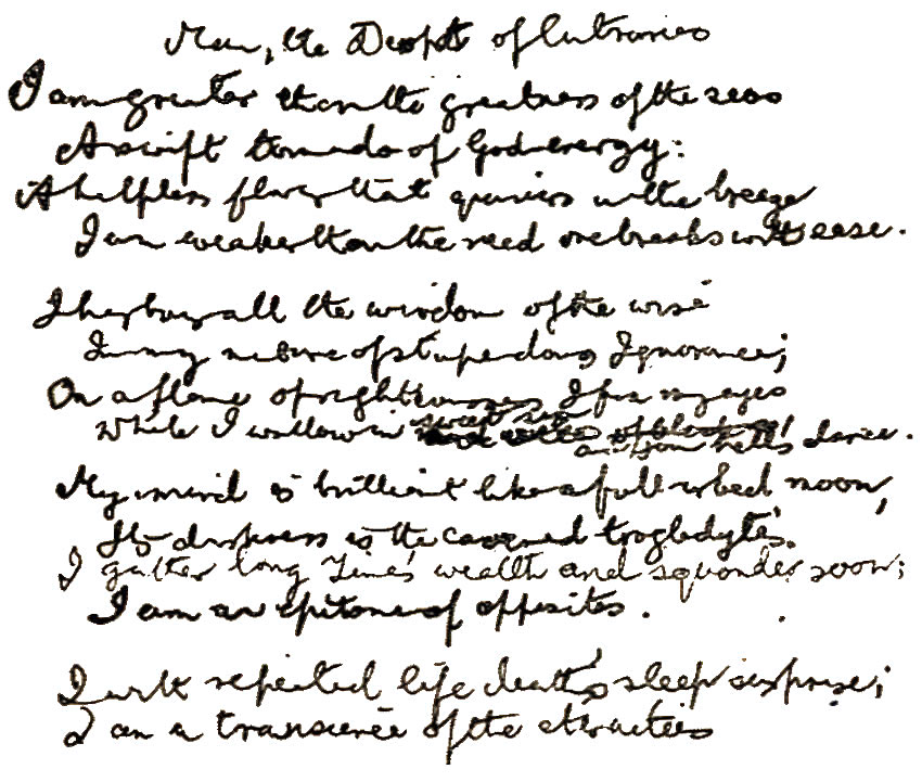 I AM greater than the greatness of the seas A swift tornado of God-energy: A helpless flower that quivers in the breeze I am weaker than the reed one breaks with ease.