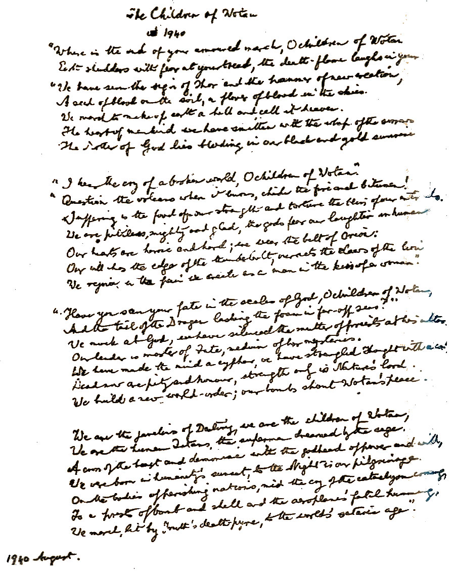 "Have you seen your fate in the scales of God, 0 children of Wotan, And the tail of the Dragon lashing the foam in far-off seas? " "We mock at God, we have silenced the mutter of priests at his altar. Our leader is master of Fate, medium of her mysteries. We have made the mind a cypher, we have strangled Thought with a cord;