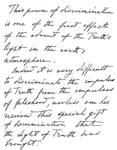 This power of discrimination is one of the first effects of the advent of the Truth’s light in the earth’s atmosphere.