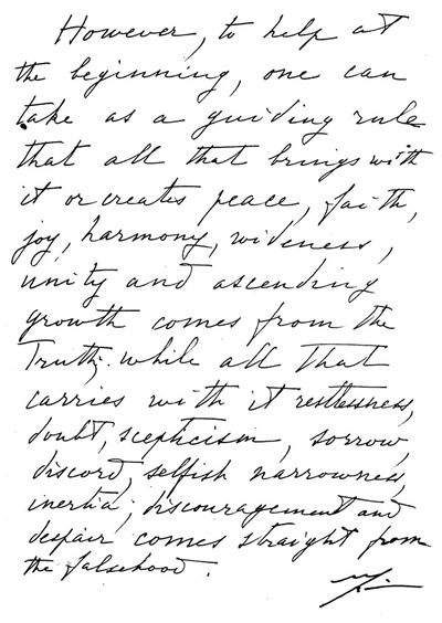 However, to help at the beginning, one can take as a guiding rule that all that brings with it or creates peace, faith, joy, harmony, wideness, unity & ascending growth comes from the Truth, while all that carries with it restlessness, doubt, scepticism, sorrow, discord, selfish narrowness, inertia, discouragement and despair comes straight from the falsehood.