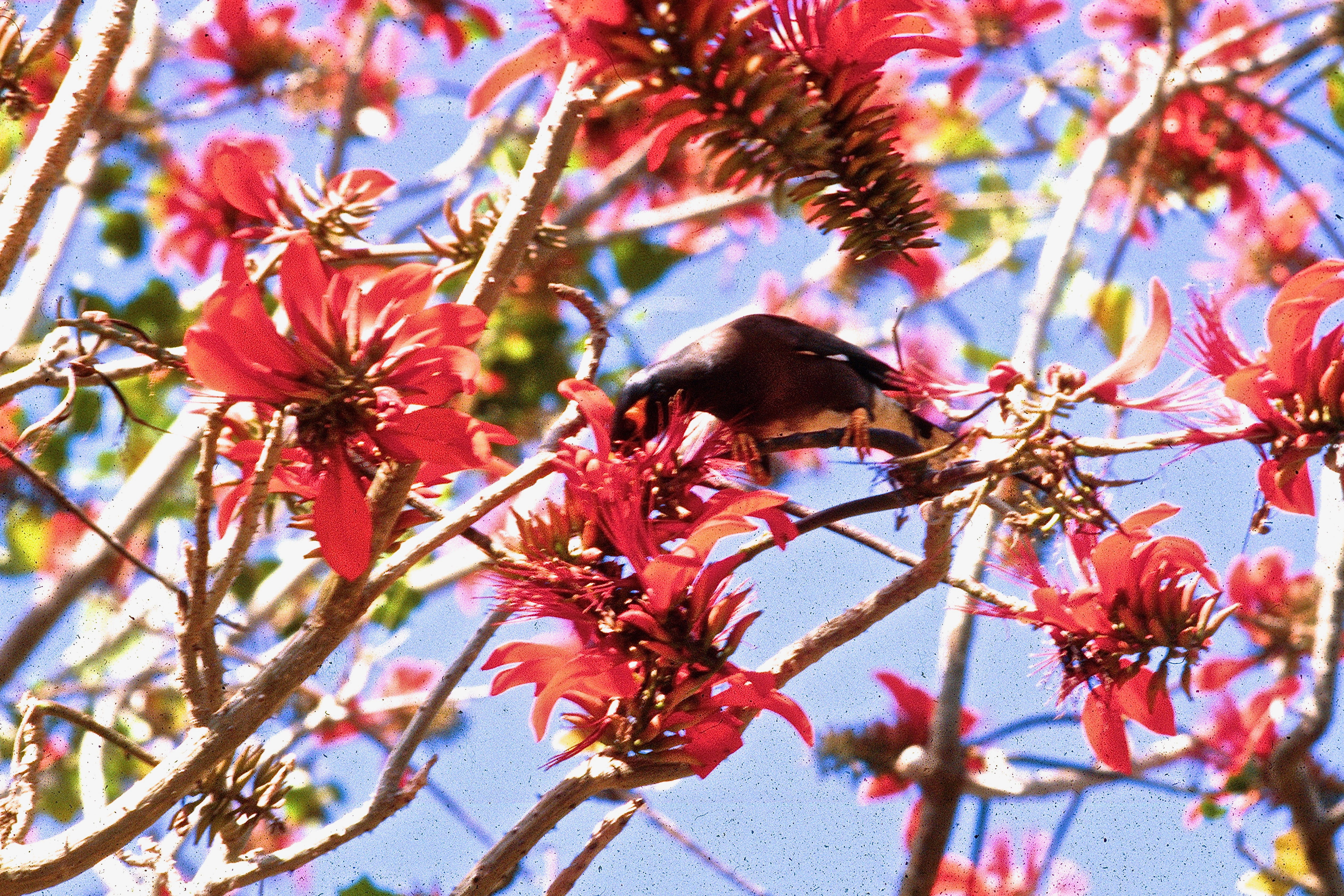 In the early days of Auroville, around 1970-1972, we planted this tree in the Matrimandir Nursery and it bloomed profusely. It also gave us one of the most humorous experiences for at a certain time of the year when its leaves had fallen and it suddenly burst into bloom it offered its liquid nectar to many species of birds, especially mynah birds, crows and others. So, around 5:00 a.m. we were awakened abruptly by the calls and conversations of all birds who had gathered for their morning beverage.