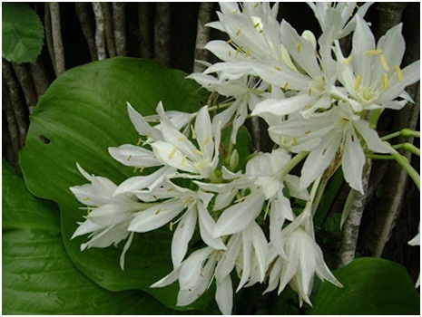 Proiphys amboinensis is another easy-to-grow bulb native to Thailand, Indonesia, the philippies and Queensland and western Australia. It prefers a lightly shaded area and requires a considerable amount of water but the milk-white flowers borne in umbels are lovely. It too is in the Amaryllidaceae family. The rounded leaves are also beautiful.