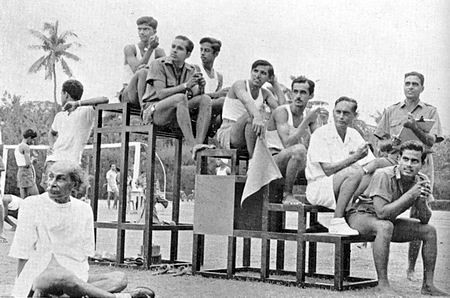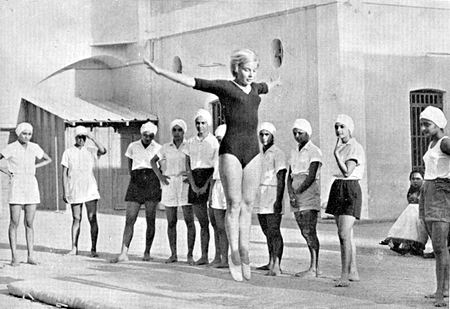 Shanta (Mademoiselle Ilon Echgold, d'Allemagne) monitrice de gymnastique, avec ses élèves