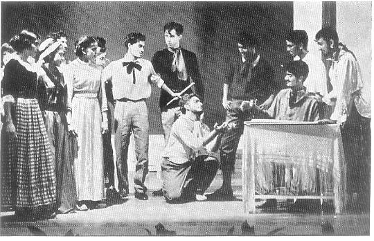 On the 13th May, Shri Akhilesh Kumar Bhatt of Bihar gave Hindi recitations from the Ramcharit-Manas of Tulsidas. On the 20th May, our students and teachers staged a small play and a skit in Bengali. On the 14th June Shri Nemai Charan Harichandan of A.I.R. gave a recital of Odissi devotional songs. On the 1st July Smt. Anjana Mukherjee sang some of Tagore's and devotional songs. The Saturday Programmes of this quarter featured French, English, Sanskrit, Hindi and Bengali recitations and plays by the little ones. There were also programmes of memory tests and student compositions in French and English. Recorded music. Eastern and Western, classical and modern—were week-end features. Among the films we saw this quarter were "Spartacus", "Le Mariage de Figaro", "Jungle Cat", "Dadimaa", and "Smritituku thak" besides documentaries sent to us by the British, Indian and Japanese organisations : There were two notable events at the Theatre this quarter. On the 17th April we arranged a performance of Ballet, Indian Songs and Dancing as a demonstration for the well known Rumanian Choreographer, Mr. Petre Bodeut. We publish a picture of Mr. Bodeut with the performers. On the 27th April, Yeats' 'Countess Cathlyn' was staged by students of the Dramatic Class. |