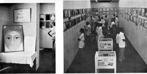 We had during this quarter around the Darshan period, a very noteworthy exhibition of the paintings on "Savitri". All the twelve of this great Epic of Sri Aurobindo were illustrated by 460 pain These were exhibited, each picture with its corresponding verse, in the four Exhibition rooms of the house. The whole work was by Huta, directly inspired and guided in her work by The Mother Herself and the sketches of The Mother on which these paintings were based were also exhibited. Each visit to the exhibition was indeed a remarkable experience. As The Mother Herself commented : "The importance of Savitri is immense. Its subject is universal, revelation is prophetic. The time spent in its atmosphere is not wasted. Take all the time necessary to see this exhibition. It will be a happy compensation for the feverish haste men put now in all things they do." In the same period of the Darshan there were other exhibitions which aroused much interest. These were : The exhibition of Batik and Fabric painting at the Art House, Needle-work |