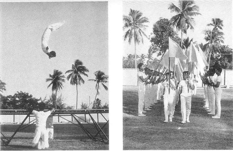 The month of November was devoted to the practice for our annual demonstration of the 2nd December. In this 370 members participated in the 15 items commencing with the march past and ending with the Aurevoir. In the Mass Exercises 265 members took part. There were a number of drills and pyramid tableaux, vaulting, rhythmic movements, parallel bars, freehand exercises, the trampoline and a colourful Santhal dance. The audience, including a larger number of invited guests from the city, witnessed the performance with much interest. After this there were our usual annual outings which lasted till we recommenced our new academic year with normal group activities on the 16th December. In the new year groups were reorganised, the group F being sub divided into F1 & F2. The E group now has a new uniform with khaki shorts instead of white. The total membership of the J.S.A.S.A. now stands at 967 of which 563 are boys and men and 404 girls and ladies; the largest number of 230 being in the non-group. The normal group activities will continue till the end of March. In this Season we will follow our revised scheme of Minimum Physical Fit ness Tests which must be passed by all members up to the age of 25 who wish to join the competitions. Instructions for this scheme and the schema of the tests have been posted on the notice board. We have also started, in this season, some of the Games tournament of Cricket and Table Tennis. I From the 31st December Hans Ruhr has commenced his coaching in diving which will continue for 2. 12 months. Gymnastic coaching by Eckart Schulze Vellinghausen for one month, both for beginners and advanced students has also been started. |