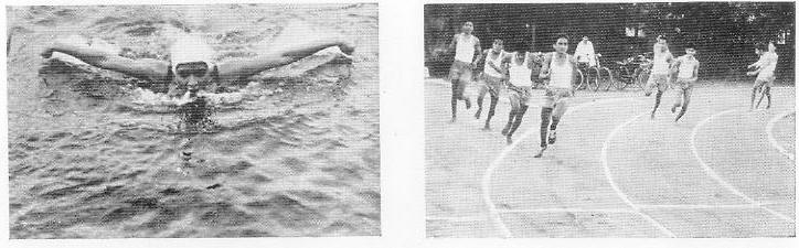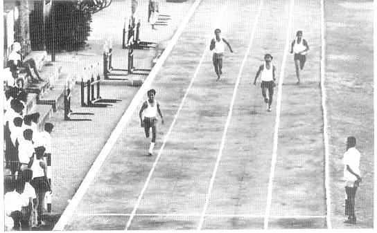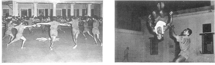 Voici les détails de ces programmes : Première période. Athlétisme pour les hommes — 139 inscrits venant des groupes D, F, H, des capitaines et des sans-groupe. Quelques inscrits avaient moins de seize ans, et d'autres plus de soixante. Les épreuves olympiques habituelles ont été disputées de même que le décathlon et le pentathlon. La période s'est terminée par la lutte à la corde, des courses de relais et des courses de fantaisie. Huit records de l'Ashram et vingt-cinq records de groupe ont été améliorés. Dames — jeux. Il y eut 55 inscriptions des groupes C, E, G, des capitaines et des sans-groupe. Les jeux étaient le basket bail, le volley bail, le hockey, le throw bail, le soft bail et le football. Juniors — sports aquatiques. Il y eut 48 inscriptions pour la natation et 46 pour les plongeons, divisées en six groupes. Cinq records de l'Ashram et quinze records de groupe ont été améliorés. La période s'est terminée par des courses de relais et des courses de fantaisie. Enfants — gymnastique. Il y eut en tout 164 participants des groupes A pour les épreuves individuelles et les exercices d'ensemble. Deuxième période. Hommes — gymnastique. Il y eut 56 inscriptions pour la gymnastique olympique, 42 pour les exercices gymnastiques et 7 pour les poids. L'entraînement a été permis jusqu'au 22 mai et les concours ont pris fin le 31 mai. Dames — sports aquatiques. 50 participants. Sept records de l'Ashram et vingt-trois records de groupe ont été améliorés. La période s'est terminée par des courses de relais et des courses de fantaisie. Juniors — athlétisme. 92 membres du groupe B y ont pris part. Les concours ont duré vingt jours et se sont terminés par la lutte à la corde, des courses de relais et des courses de fantaisie. Huit records de groupe ont été améliorés. Enfants—jeux. 80 enfants des groupes A ont pris part aux jeux normaux et aux jeux spéciaux pour les petits enfants; quelques exercices y étaient compris. |