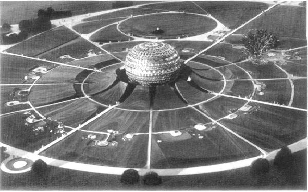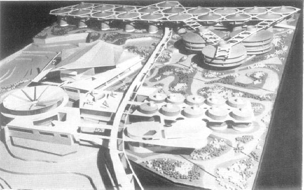 Vue générale de la maquette choisie pour le "Bharat Nivas", Auroville |