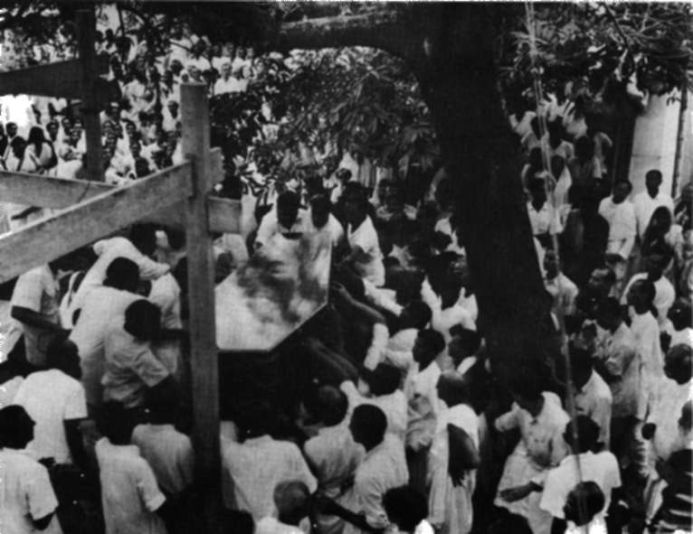 Later I took one more roll of photographs, twelve shots in which I tried to catch the moods of the devotees when they stood in queue for a last darshan of the Master and when Sri Aurobindo's casket was brought down for laying in the Samadhi.