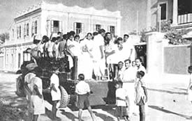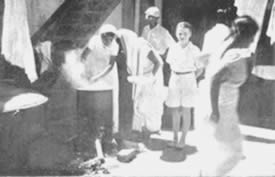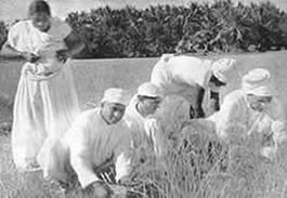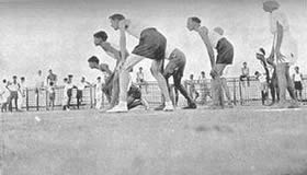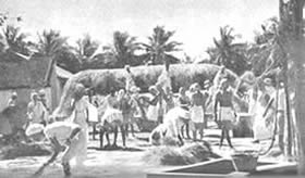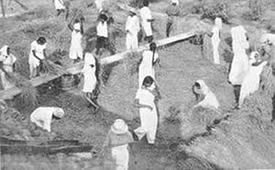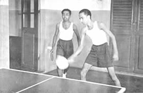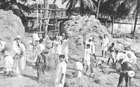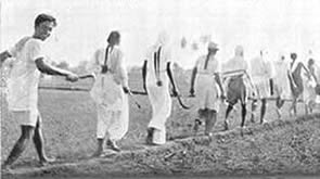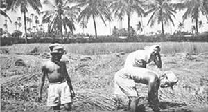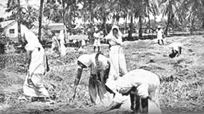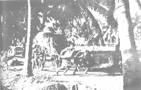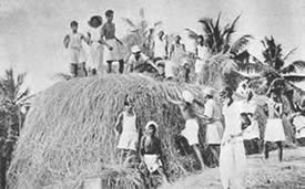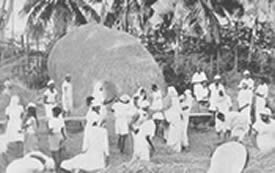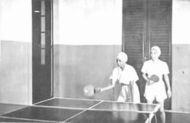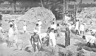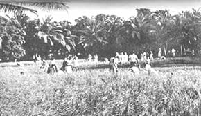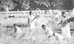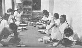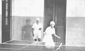 Les doubles du tennis de table eurent beaucoup de concurrents et furent bien disputés. Jouer le volley-ball en doubles est inhabituel, car il se pratique généralement par équipes de six. Le jeu eut donc l'intérêt de ce qui sort de l'ordinaire. Il en fût de même du tournoi de circle-ball. C'est généralement un jeu pour les juniors; mais il fut organisé en mixtes, avec hommes, filles et juniors répartis également entre les équipes. Les jeunes filles jouèrent avec entrain et les juniors se comportèrent très bien; en plusieurs cas ils remportèrent la victoire pour leurs équipes. La Balle au panier obtint de bons résultats, le vainqueur plaçant la balle 23 fois sur 30 coups. A part ces tournois, nous eûmes une occupation qui ne figure généralement pas dans les systèmes d'éducation physique: notre moisson. Nous avons nos propres champs de riz et la moisson de ce riz a pris une place dans notre programme d'éducation. Elle a un but utilitaire et offre un bon exercice en plein air et au soleil. Ceux qui y participèrent firent du bon travail et passèrent un bon moment en même temps. Bien qu'il nous fut impossible de tenir nos épreuves aquatiques, nos membres ne renoncèrent pas à la natation et un grand nombre prirent des bains de mer. La plage de la partie Nord de Pondichéry était auparavant trop sale pour être utilisée de la sorte. Mais depuis que nous avons converti le terrain vague attenant, qui servait de dépotoir, |