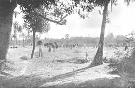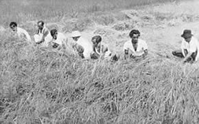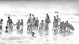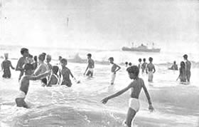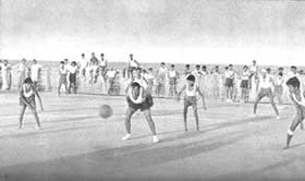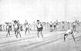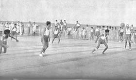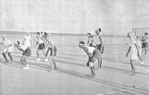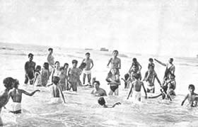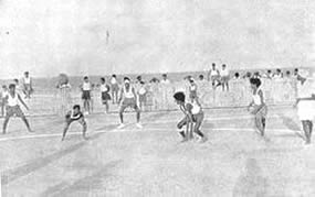 Table Tennis Doubles Volley Ball Doubles Circle Ball Shooting the basket competition. The Table Tennis Doubles attracted many entries and the games were well contested. The Volley Ball Doubles was unusual as it is generally played six a side. It had therefore the interest of the unusual. Similarly with the Circle Ball tournament. this is generally a minor game for the junior, but we had it in a mixed form with the men, girls and juniors divided evenly in each team. The girls played up bravely and the juniors showed up very well and in some cases even won the match for their teams. Shooting the Basket showed good results with the winner scoring 23 Baskets out of 30 throws. Besides the tournaments, we had one other event which does not generally figure in a Physical Education scheme. It was our harvesting. We have our own rice fields and the harvesting of these fields has found a place in our scheme of Physical Education. It serves a very useful purpose and affords a great deal of exercise in the open air and sun. Those who attended the harvesting did a good job of work and enjoyed themselves at the same time. Though we were not able to have our aquatic sports, members would not be denied their swimming and large numbers started open sea bathing. The beach at the north end of the Pondicherry Boulevard was formerly too dirty to be used by sea-bathers; but since we have converted the waste ground there in to Tennis Courts and playgrounds, |