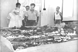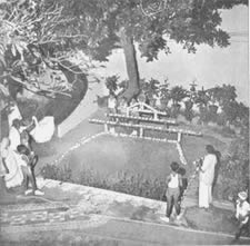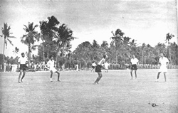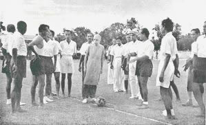 The school premises are actually on the site where the university centre building will be erected. The existing buildings have been remodelled to house the school but later all these buildings will be demolished to construct the university building as already planned. There was another opening ceremony performed by the Mother during this quarter. It was of our new Football Ground at the Terrain de Sports. This new ground is within the boundaries of the 400 meter running oval track previously constructed. It has been carefully prepared with a well maintained grass surface. In the rural surroundings this piece of a well kept green lawn makes a beautiful picture. The ground was opened with a March Past and a match between the J.S.A.S.A. Eleven and a team composed of veteran players of the Ashram. The match was commenced by the Mother giving the "kick off" as can be seen from the illustration in this issue. It was a highly amusing game and provided a good deal of amusement to the spectators. |