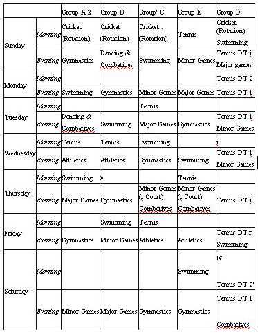 I. Major Games—consist of Football, Hand-ball, Hockey and Cricket. II. Minor Games—consist of Basket ball. Volley-ball. III. Swimming—(a) Thursday & Saturday Evenings } The Pool will be open to all who have no other programme. Monday & Tuesday Mornings ) (b) Sea Bathing is open to all every day. (c) Until the Swimming Pool is ready and whenever it is closed for cleaning, the Groups may have their choice of the following alternatives: Sea bathing, jumping, shot-put, sprinting and hurdles (on the Terrain de Tennis) combatives (if place is free), wall tennis and dancing. IV. Table Tennis—will be on the present lines, i.e., members will be arranged according to tables. V. Asanas—Programmes will be arranged for those who wish to practise asanas. VI. Weight Lifting & Body Building, Malkham, .& Special "Keep fit" class for Ladies—will be open to all who wish to join and arrangements have been made for a gymnasium, malkham and special "keep fit" exercises. VII. Combatives—Consist of Boxing, Wrestling, Fencing, Lathi (with Malkham also as part of wrestling). This is open to all members every morning. VIII. Cricket—will be available on Sunday mornings in rotation for Groups A, B, C, & D. IX. Athletics & Games—(a) the Terrain de Sports will be open to all members for Athletics practice in the morning on Monday, Wednesday, Thursday & Saturday, and to Members of C & D Groups only for Major Games on Tuesday & Friday mornings except when the grounds are closed for maintenance & repair works. (b) The Terrain de Tennis will be open to all members for Jumps, Shot-put, Sprints & Hurdles—every morning. X. Basket Ball & Volley Ball—(a) The courts will be open to all members in the mornings every day except when they are closed for maintenance and repair works. VENUES Terrain de Jeu For Group AI from 4.30 to 5.30p.rn. For other Groups, for Gymnastics & Dancing, from 5.30 to 6.45 p.m. For all Groups, Marching, Concentration & Distribution after 6.45 -p.m. Gymnasium For Weight Lifting, Body Building, Asanas & Malkham & "Keep Fit" from 4.30 p.m. Volley Ball Ground for Volley-ball, 6.00 to 9.00 a.m. & from 4.30 p.m. Terrain de Tennis 1) For Tennis & Wall practice Mornings 6.00 to 10.00 a.m.. Evenings 3.30 p.m., Sundays 3.00 p.m. 2) Basket Ball—4.30 p.m. 3) Practice for all Jumps, Shot-put & Sprints (also hurdles) 4.30 p.m.. 4) Combatives 4.30 p.m. Terrain de Sports 1) Athletics 2) Major Games . 3) Swimming 5.45 to 7-30 a.m. on Week Days and 5.45 to 11.00am.on Sundays, Evenings 4.30 p.m, |