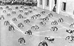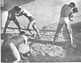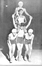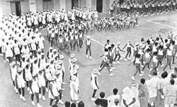 to the capacity of the sub-group). The judgment was based on the following points:—approach, performance and finish—done with correct technique, grace and neatness. The programme was similar to that of the Athletics Competitions, with some sub-groups competing every day, each doing one category. Thus we had a variety daily and there was no strain on the competitors. For calisthenics, each competitor had to perform the whole of the Mass Drill that had been prepared for the 2nd December. So these competitions also served as a preparation for the annual demonstration. And this year's Mass Drill was certainly a strenuous affair and needed a great deal of practice. It was not everyone who could do it and this also made an automatic selection. As a matter of fact, the whole competition served as a selection for the performers and events of the 2nd December programme. In addition to this, there were special competitions in Weight Lifting and Malkhamb. In weight lifting, as the competitors were few, we were able to get only one weight grouping. We had the standard Olympic lifts and the corresponding method of judgment. This was the first time we held such a competition and the results were quite promising. The lifts did not reach very high figures but they were cleanly and neatly executed and there is good promise for the future. . In the Malkhamb Competitions the younger groups had either four or five compulsory figures but with the older groups there were three compulsory and three optional figures. The performances were of a good standard and in the optional exercises the competitors showed artistry coupled with ingenuity. For those who do not have a regular gymnastic programme throughout the year, we had, what we called, "The Gymnastic Test". This comprised I) Chinning, 2) Dips on Parallel Bars, 3) Leg Raising from vertical hang and 4) Jump deep-knee bend. I These were similar to last year's events and the results also were decided by the number of repetitions. The competitions were much more interesting this year and they have considerably increased the interest in gymnastics. Next year we will have many more enthusiastic competitors. We |