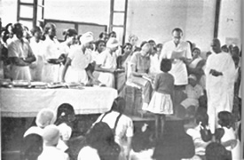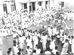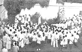 ont certainement augmenté l'attrait de la gymnastique, si bien que l'année prochaine nous comptons sur davantage de concurrents enthousiastes. On trouvera par ailleurs dans ce bulletin le programme détaillé des épreuves, ainsi que le programme des fêtes des Ier et 2 Décembre. En réalité ces fêtes eurent lieu, non pas les Ier et 2 Décembre, mais le 2 et le 3. Un cyclone toucha en effet la région dans la nuit du 30 Novembre en causant un peu partout des dégâts importants. Il emporta en particulier notre scène en plein air qui ne put être remise en état, après des efforts herculéens, que pour le 2. La distribution des prix de l'école eut lieu comme d'habitude le Ier, mais le programme sur la scène fut reporté au 2. Il était cette année copieux et varié, avec récitations, chant, danse. En plus de la danse en style traditionnel indien, nous eûmes deux sketches de ballet. Pour le chant, nous entendîmes un solo d'opéra, puis notre chœur; celui-ci a encore fait des progrès et il eut en grand succès. Une longue récitation extraite du poème de Sri Aurobindo "Savitri" termina le programme, dont elle fut le moment culminant. Le 3 Décembre prirent place le grand exercice d'ensemble, puis des exercices par les tout petits et les démonstrations de gymnastique exécutées par les gagnants des championnats. Il y eut aussi une démonstration d'acrobatie, puis sur une musique suédoise, un exercice rythmique de jeunes filles, qui fut remarquable et gagna des applaudissements nourris. Nous commémorâmes les 5 et 9 Décembre en méditation silencieuse avec la Mère. Le matin du 5 nous étions dans l'appartement de Sri Aurobindo, et le 9 autour du Samadhi. On en trouvera des photographies ailleurs dans le bulletin. Le 25 Décembre enfin, nous eûmes le traditionnel arbre de Noël, avec des cadeaux pour les enfants, et aussi un souvenir pour tous les autres. Après une distrayante pantomime et les chants de Noël de notre chœur, les lumières dans le sapin, la distribution des cadeaux, les cris et la joie des enfants accompagnèrent le déclin de l'année, pendant que nous nous préparions à l'année nouvelle. |