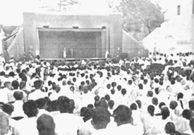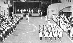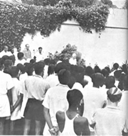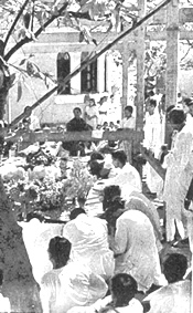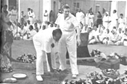 publish elsewhere in this number the programme of the competitions, and also the programme of the 1st and 2nd December. Actually the programmes were held on the 2nd and 3rd December instead of on the 1st and 2nd. This was on account of the cyclone which hit this coast on the night of the 30th November causing considerable damage all round. It tore our open air stage to shreds and it could only be made ready again, with herculean efforts, for the 2nd. The School Prize Distribution was on the 1st as usual but the entertainment on the stage was on the 2nd. This year we had a full and colourful programme of recitations, singing, and dancing. In addition to the dances in the Indian tradition we had two sketches in Ballet. For singing we had an operatic solo and then our choir. This has improved even further and its performance was very well received. Finally we had a long recitation from Sri Aurobindo's "Savitri" which was, indeed, the high light of the programme. On the 3rd December we had some events by the little ones, the mass drill and the various gymnastic figures of the competition done by the prize winners. There was, in addition, a demonstration of acrobatics and then a Swedish musical drill by the girls which was very ably done and earned well merited applause. We observed the 5th and 9th December in quiet meditation with the Mother. On the morning of the 5th we were in Sri Aurobindo's rooms and on the 9th around the Samadhi. We publish photographs of this in our present issue. For the 25th December we had again the traditional Christmas Tree with presents for all the children and also something for everyone else. We were first much entertained by a comic dance in pantomime and then by special Christmas numbers by our choir. After, came the gay lights twinkling in the tree, and the presents and the noise and shouts of the little ones enjoying themselves. It was a fitting note on which to end the old year and to prepare ourselves to receive the new. |