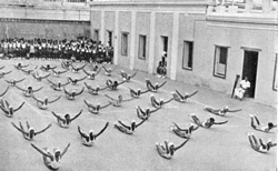 donnés pour la préparation, l'exécution et la sortie, en tenant compte de la technique, de l'élégance et de la précision. Comme pour l'athlétisme, le programme de chaque jour prévoyait des épreuves pour un certain nombre de sous-groupes, avec une épreuve variée pour chacun. Il y avait ainsi suffisamment de diversité pour les spectateurs, sans fatigue exagérée pour les concurrents. Pour les exercices rythmiques, chaque concurrent devait exécuter l'exercice d'ensemble prévu pour le 2 Décembre, ce qui assurait une répétition en vue de la fête annuelle. Et l'exercice d'ensemble prévu cette année n'était certainement pas négligeable: il exigeait un sérieux entraînement. Tous ne pouvant en venir à bout, nous bénéficiâmes d'une sélection automatique. En fait toutes les épreuves permirent une sélection, aussi bien pour les exercices à retenir au programme du 2 Décembre que pour leurs exécutants. Nous eûmes en outre des épreuves spéciales de lever de poids et de Malkhamb. Aux poids, où il y avait peu de concurrents, nous ne pûmes former qu'un groupe. Nous avions les levers standards des jeux olympiques dont nous avions aussi adopté les règles. C'était ici la première épreuve de ce genre, et les résultats furent très encourageants. S\ les levers n'atteignirent pas des records sensationnels, ils furent très correctement exécutés, ce qui nous donne bon espoir pour l'avenir. Dans les épreuves de Malkhamb, les groupes les plus jeunes avaient cinq ou six figures obligatoires, alors que les groupes plus âgés en avaient trois obligatoires et trois facultatives. Les performances furent bonnes, et dans les figures laissées à l'initiative des concurrents ceux-ci firent preuve d'imagination et de sens esthétique. Pour ceux qui ne suivent pas un entraînement gymnastique régulier au cours de l'année, nous eûmes ce que nous appelâmes "Le test de gymnastique". Il consistait en i°) Tractions aux anneaux, 2°) Flexions aux barres parallèles, 3°) Équerre des jambes en suspension verticale 4°) Sauts alternativement sur chaque jambe genou plié. Ces épreuves étaient analogues à celles de l'année dernière et étaient aussi jugées au nombre de répétitions. Au total, les épreuves de cette année, qui furent intéressantes, |