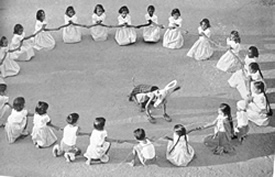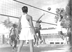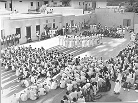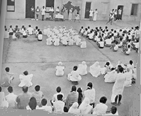 LE 1er Mai a vu comme d'habitude la distribution des prix qui clôture la saison des jeux. Une fois de plus cette saison s'était étendue sur deux trimestres puisque la piscine qui est en construction n'est pas encore une réalité. Nous eûmes tous les championnats que peut permettre cette durée de deux trimestres. Au tennis, en plus des doubles mixtes, nous eûmes les double hommes et les double dames. La forme du championnat tournant permet à tous de jouer dans les conditions de la compétition sans toute la tension des championnats en formule éliminatoire. Nous la préférons donc chaque fois que nous le pouvons. Nous l'avons adoptée aussi pour le foot-ball, le basket-ball et quelques autres jeux de moindre importance. L'intérêt ainsi que le niveau des jeux sont restés aussi soutenus que par le passé. La compétition fut très vive, et un progrès général été enregistré. Le 24 Avril prit place le salut officiel des J.S.A.S.A. à Sri Aurobindo et à la Mère. Le programme du jour commença comme d'habitude avec le salut à la Mère à son balcon. Il fut donné par les groupes en formations, puis, après le défilé devant le Samadhi, la Mère présida la concentration autour du Samadhi. Chacun passa ensuite en file dans les chambres du premier étage recevoir des mains de la Mère la prière du jour avec ses bénédictions. Au début de l'après-midi, une exposition à la bibliothèque du Centre Universitaire montrait les représentations de la Mère à travers les âges. Dans la soirée, après un court programme de chant, de danse, et de récitation, le dernier numéro du Bulletin fut distribué. Les petits en particulier nous donnèrent une séance très divertissante. |