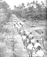 Les enfants traversent un de nos jardins, on route pour le terrain de sports