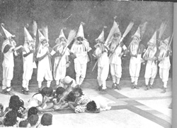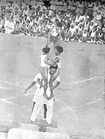 and is a corresponding vehicle to the Mother's action when so used by Her. These significances have been expressed and explained by the Mother for almost every variety and sub-variety of flower that has come to Her. These have now been collected, classified and published by us in a booklet called "Le Role des Fleurs" in which each flower is identified by its common name and its botanical name, and is then given its significance in French and in English. This booklet was distributed at the Exhibition. Many flowers were shown, either in themselves, or in pictures and paintings and embroideries and even by suggestion; and their significances and occult values were indicated with much ingenuity and taste Now we come to the 1st and 2nd December. As the available talent is increasing—and at such a rapid rate, programmes have a tendency to become longer. But this time we made a record in having a programme for the 1st December which lasted about seven hours. Yet almost everyone agreed that this long session —with an interval of half an hour in between, was not at all tiring and the audience was kept interested till the end. The items, as usual, comprised of recitations, music, dances and recitals. There was also a short one act play in French. The dances, which made up the greater part of the programme, were numerous and varied. They ranged from that of the little children—which was very well received—to one by a master of the art from Calcutta who had come down specially for the purpose. There was also a dance in the traditional style and a long dance interpretation of Sri Aurobindo's "Love and Death". Western dancing was also represented by two short sketches. The programme terminated on a high note with a grand recital of the Canto 4 of Book VII of Sri Aurobindo's "Savitri". The next day, the programme was a little less long—about four hours—and that also was full of interest to the very end, Besides the display of regular gymnastic events and drills, we introduced this year some bouts of fencing, boxing, and wrestling, and weight lifting with feats of strength. A further innovation was wire balancing and roller balancing. The display of yogic |