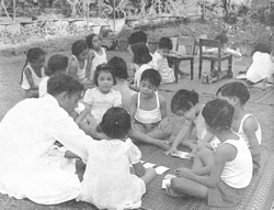 LA saison de la gymnastique est bien accueillie, non seulement à cause de la gymnastique, mais pour des raisons variées. Outre les concours habituels, c'est pendant ce trimestre qu'ont lieu les fêtes anniversaires de l'École, les Ier et 2 décembre, ainsi que les vacances annuelles des enfants. Dans le monde entier les enfants ont l'habitude de se réjouir à l'avance des vacances qui les soulageront de la routine quotidienne. Chez nos enfants, on trouve une pâle réflexion de cette habitude, et elle devient plus pâle chaque année. En tout cas le prétendu sentiment de soulagement ne dure que quelques jours. Nous avons tous ici tellement l'habitude d'une vie pleine—où chaque instant de la journée est pourvu d'une activité dirigée— que ce changement soudain, qui provoque une coupure dans le programme des jours, dérange et disloque plutôt qu'il ne soulage. Après quelques jours, la plupart des enfants commencent à attendre la réouverture de École. Pourtant, ils ont largement de quoi faire avec les préparatifs lents des Ier et 2 décembre. Les programmes sont devenus si complets out qu'ils requièrent la participation d'un grand nombre d'élèves et les tiennent occupés pendant toutes les vacances. Avant d'en arriver à ces deux journées, cependant, nous devons parler du Darshan du 24 Novembre. Le matin comme d'habitude, nous avons reçu la bénédiction de la Mère; à tous Elle a distribué un fragment inédit des œuvres de Sri Aurobindo, une belle et émouvante prière à "La Mère des Splendeurs." L'après-midi, à la bibliothèque du Centre Universitaire, la Mère ouvrit une exposition sur "Les fleurs, dans leur relation avec le Yoga". Les fleurs ont toujours joué un rôle important dans notre vie ici. A part la beauté de forme, de couleur et de parfum qu'elles apportent dans notre existence journalière et la joie qu'elles donnent à ceux qui les soignent, et ils sont nombreux, |