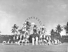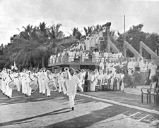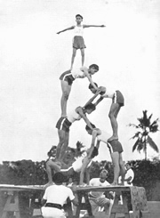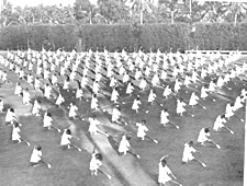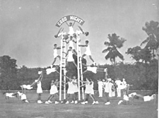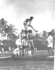programme complet de ."La Destinée Spirituelle de l'Inde", avec une traduction anglaise et française, est publié dans une brochure spéciale, en supplément à ce numéro. La fête sportive du 4 Décembre eut lieu cette fois-ci sur notre Terrain des Sports qui s'étend dans un magnifique cadre naturel. Un système d'éclairage avait été spécialement arrangé à cette occasion. L'exercice d'ensemble fut des plus impressionnants, plus de trois cents personnes appartenant à nos divers groupes y prirent part. Le numéro d'acrobatie fut aussi vivement apprécié. L'exercice au rotin était une nouveauté, et l'exercice avec drapeaux fut un très bon spectacle. Il y eut aussi une démonstration de poids et haltères et d'âsanas, accompagnée de commentaires. Les 5 et 9 Décembre, anniversaires du retrait physique et du samâdhi de Sri Aurobindo, furent célébrés comme les années passées, il y eut une méditation autour du tombeau de Sri Aurobindo et dans la chambre du Maître. Puis ce furent les fêtes de Noël avec l'arbre traditionnel et des cadeaux pour tous, petits et grands. Il y eut un court programme de musique par notre fanfare et deux petites scènes jouées et écrites par les enfants eux-mêmes. Le 6 Janvier, anniversaire de l'ouverture de notre Centre Universitaire, nos élèves jouèrent un drame égyptien, écrit et mis en scène par l'un des professeurs du Centre. Au cours de ce trimestre nous avons participé à un championnat de Tennis organisé par le Cercle de Pondichéry. Nos joueurs se distinguèrent en remportant toutes les épreuves: simples et doubles messieurs, simples dames et doubles mixtes. |