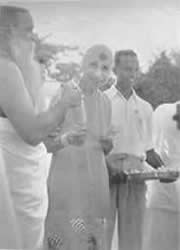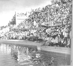 Then came the great day. Balcony Darshan was at 6-15 a.m. and the Darshan of the Mother at 10 a.m. when we received Her Blessings and a message. Then at 3-45 p.m. we all assembled at the Sports Ground, in our new white uniforms, which were specially made for the occasion. The March Past was at 4 p.m. and then, at long, long last, the Mother opened our Swimming Pool—for which we waited so many years, There followed an exhibition of swimming, diving and life- saving, concluding with some swimming formations. It was a fine show, especially considering that the swimmers had had but very little time to prepare for it.
