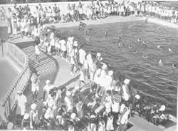 There are two rows of dressing and toilet rooms, one for men. and the other for ladies. There is a one way movement through these rooms, which passes under a gang shower and through a foot bath. There is, in addition, a strict medical pro-examination of all swimmers.