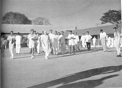 Théâtre. Plusieurs milliers de fleurs et de plantes vertes avaient été réunies et disposées avec goût. L'ensemble fut illuminé le soir et formait un beau spectacle. Un bassin avait été construit, plein de lotus blancs. La Mère se rendit ensuite au Théâtre pour assister à une représentation de danses classiques. Des arrangements avaient été faits pour que des artistes du dehors viennent présenter les quatre différentes écoles de danses indiennes : Bharat Natyam du Sud de l'Inde, Kathak du Nord, Manipouri de l'Assam et Kathakali du Malabar. Ce fut un spectacle impressionnant et tout le monde fut très heureux d'avoir eu l'occasion de voir, en hommage à la Mère, au même endroit et le même jour, les quatre styles traditionnels de danse indienne. Deux jeunes danseuses de talent, Koumari Vanamala et Koumari Malati firent une gracieuse exhibition de Bharat Natyam, et montrèrent les différents aspects de la danse. Srimati Priti Ghose et sa troupe exécutèrent ensuite des danses Kathak et Manipouri. Finalement, le grand Gopinath avec sa troupe interpréta pour nous les richesses de la danse Kathakali. Tous les artistes offrirent leur hommage à la Mère, qui leur donna sa bénédiction, ainsi que des souvenirs de cette journée. Le jour suivant, le 21 au matin, eut lieu le Darshan et la distribution du message par la Mère, puis l'après-midi sur le terrain du Théâtre le défilé avec le salut à la Mère. Après quelques morceaux de musique joués par la fanfare, nous eûmes la distribution du Bulletin. Des rafraîchissements furent donnés ensuite dans une salle fleurie et décorée de verdure, fraîche et parfumée. Enfin, au Théâtre, les danseurs de l'Ashram exécutèrent un programme, composé d'une danse Garba et d'un drame dansé : Chandi. Après la représentation eut lieu, au Théâtre même, une méditation d'un quart d'heure, dirigée par la Mère qui avait pris place sur la scène en avant de la projection sur un écran d'un grand portrait de Sri Aurobindo. Ce fut un mémorablement événement. |