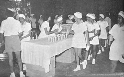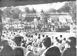 masses. These were all lighted up at night and made a beautiful display. There was also constructed a Lotus Tank full of white lotuses. The Mother then went to the Theatre to see the dance performances there. We had arranged for visiting artistes to give recitals of the four different schools of Dancing in India— The Bharat Natyam of the South, the Kathak of the North, the Manipuri of Assam and the Kathakali of Malabar. This was a grand show and we were all very happy to have had the opportunity of seeing, as a homage to the Mother, in one place and on the same occasion, all the four styles, of. traditional Indian Dancing. Two very able dancers, Kumaris Vanamala and Malati gave a fine performance of the Bharat Natyam, showing different aspects of the dance. Then came Shrimati Priti Ghose and her party, exponents of Kathak and the Manipuri dances. Finally came the great Gopinath with his party, to show us the magnificences of the Kathakali. All the dancers paid their homage to the Mother and received from Her, blessings and some souvenirs, On the next day, the 21st, there was the Darshan and distribution of the message in the morning and in the evening, the March Past and salute to the Mother at the Theatre grounds. Then some pieces of music by our Band and distribution of Bulletins, followed by refreshments in a specially prepared Green House—cool—green—fragrant. Then at the Theatre, a performance by Ashram dancers, first a Garba dance and then the dance drama of Chandi. After the dance performances there was a 15 minutes Meditation in the Theatre with the Mother Herself present there, sitting on the stage, against the background of a large projection of Sri Aurobindo's picture. It was indeed, a most wonderful experience. |