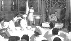 Minister for works. Housing & Supply, Sri Surendra Mohan Ghose M.P., Dr. M.S. Aney M.P., and Sri Bishvanath Das M.P. There was a short meditation in which all joined and this was followed by a hymn to Sri Aurobindo. Dhir of the Ashram then made a short speech and presented the Portrait. On the same day, at the Ashram, we celebrated Sri Aurobindo's Birthday with first the Mother's Darshan at the Balcony at 6-15 a.m., then the Mother's Blessings at 10 a.m. when She distributed Her Message for the day. In the evening we saluted the Mother at a March Past at the Playground and heard a short but excellent recital by our Band. |