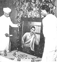 Nous parlerons ici d'un événement mémorable qui a eu lieu à Delhi sous les auspices de la branche de l'Ashram dans cette ville. Il s'agissait de la présentation d'un portrait de Sri Aurobindo au Râshtrapati Bhavan résidence du Président de l'Union Indienne). On avait remarqué que parmi les portraits des personnages éminents exposés dans la Galerie d'Art de Râshtrapati Bhavan, celui de Sri Aurobindo manquait manifestement. Informé de cela le Président de l'Union Indienne voulut savoir si la branche de l'Ashram de Delhi pourrait en donner un. La Mère demanda à notre artiste Promode Kumâr Chatterjee, qui appartint à l'école Abanindra des Arts Orientaux de Calcutta, de |