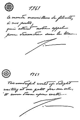 1 Later on the Mother was asked, "what is this that ? The universe ?" The Mother replied, "I said that purposely, in order not to be specific. I do not like the word "creation"; you have immediately the impression of a special creation, as if it was made out of nothing —It is Himself ! It is not the universe which begins but the universe which has begun—how to say it ? It is not the universe which initiates the movement. And if it is said that the Lord has begun the universe, it becomes false—all that, they are such fixed ideas ! And if I say, "The Lord has begun the universe", you see at once a personal God who decides to begin the universe, it is not that ! I said that in connection with Love, the manifestation of Love which is the supreme Ananda. Sri Aurobindo also has said it : Beyond the Being and the Non-Being, there is something which is, which manifests as Love Supreme and which is at once Being and Non-Being. And the first manifestation of That is the Ananda of Identity. In essence it is the Identity becoming conscious of itself in Ananda, and then that goes the whole way through the entire manifestation and all the forms that Love takes and it returns to the Unity through union. And this adds to the Ananda, the Ananda of union which would never have existed if the circuit had not been gone through. |